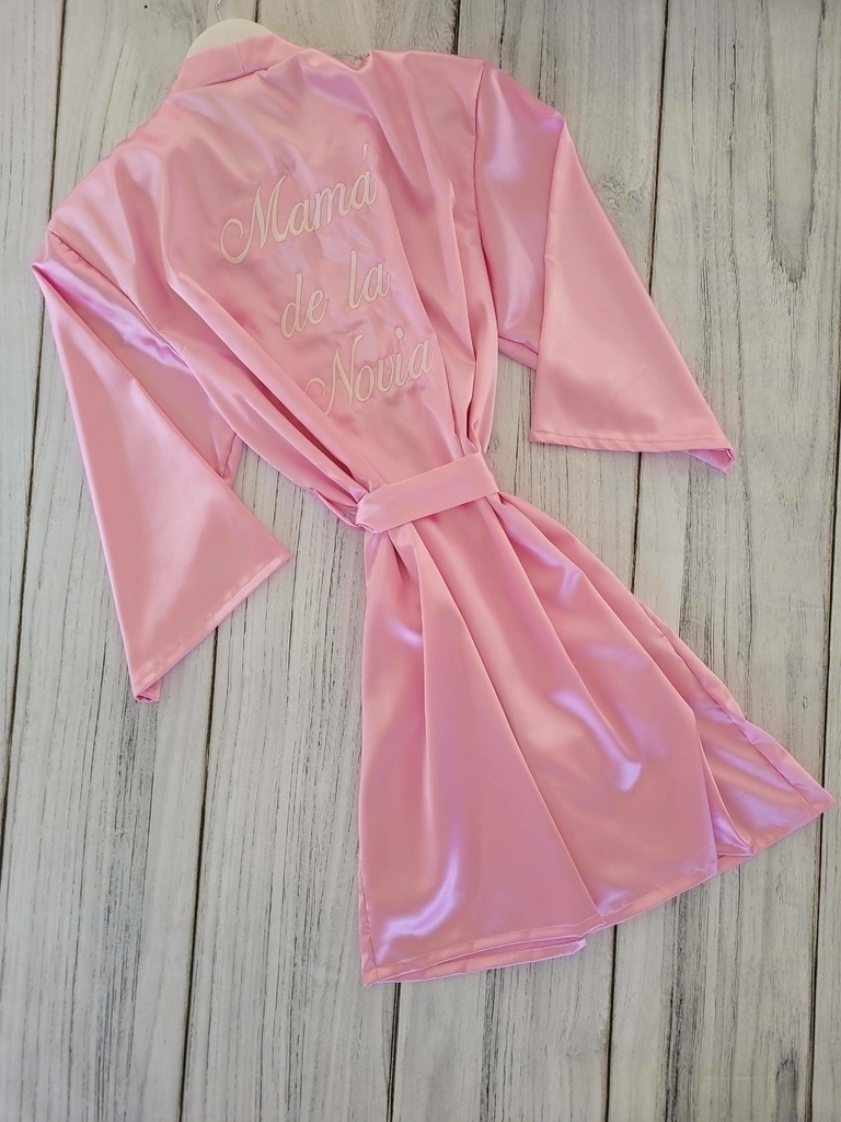 Bata confeccionada en satén de seda importado, suave al tacto y bordada con la frase “Mamá de la Novia”, un detalle lleno de amor y elegancia.